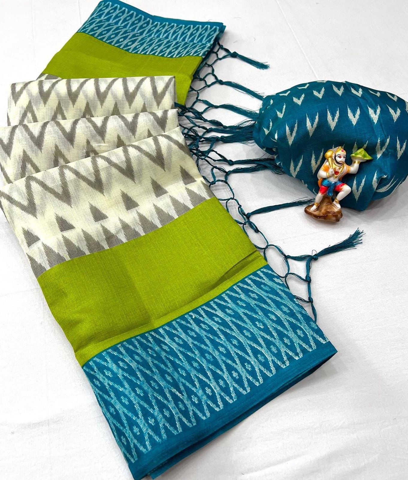 Experience everyday elegance with this beautifully crafted Khadi Silk Saree, featuring a rich HD Ikkat style print, elegant tassels on the pallu, and a matching running blouse. A perfect pick for office wear, casual outings, or gifting!
